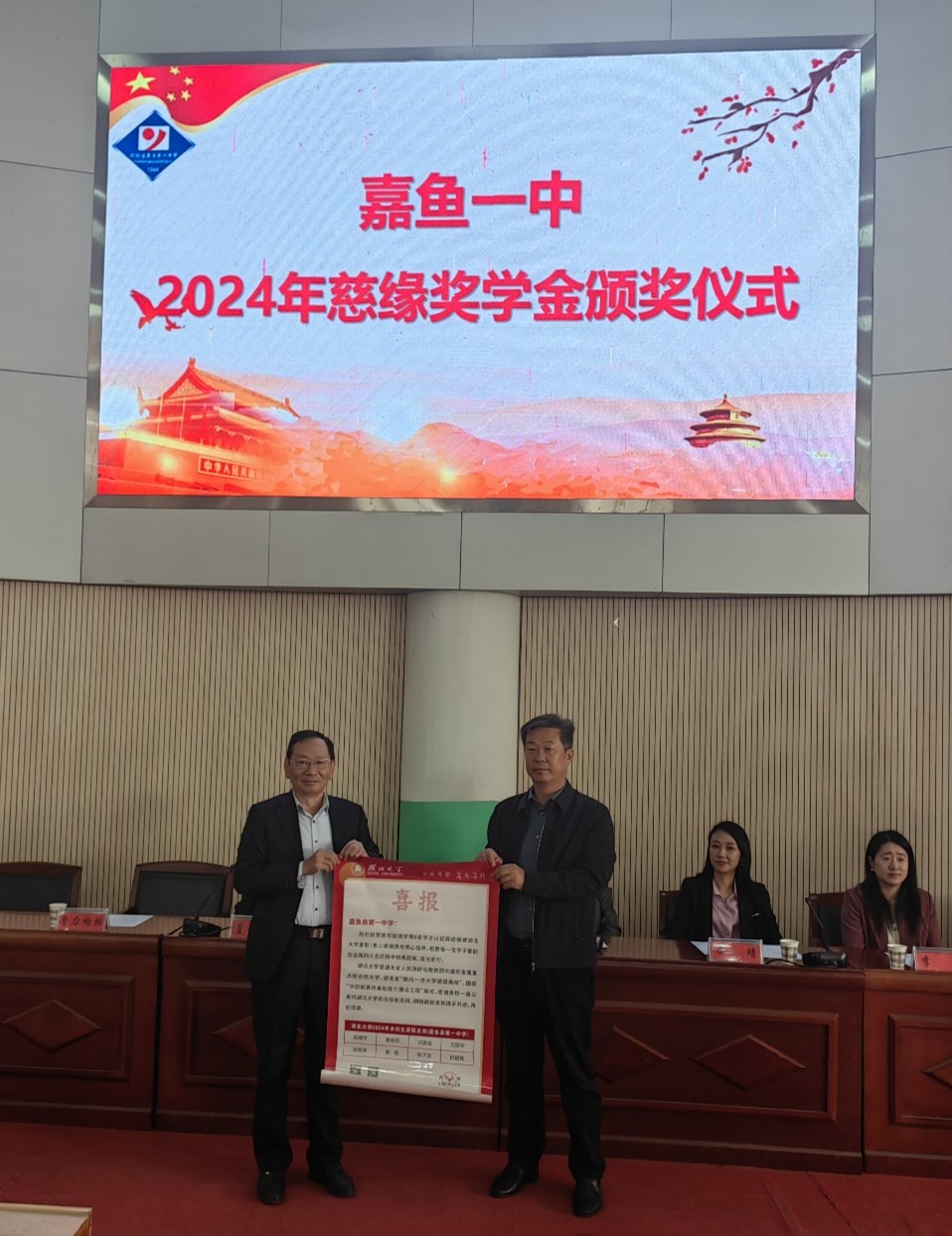 慈缘奖学金发起人叶正涛教授以及捐助人王世敏教授、董兵海教授,一同为两个学校共计二十四名学生颁发奖学金,并勉励同学们刻苦学习,以优异的成绩回报家庭和社会。王世敏教授为两所高中送去了2024年太阳成集团tyc9728录取喜报。