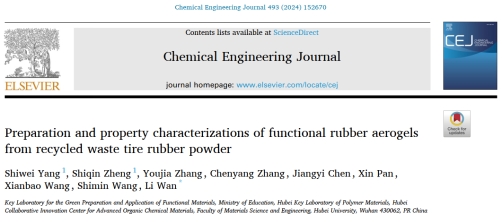 近日,我院万丽副教授指导硕士研究生杨士伟和郑诗琴,成功地设计了一种开创性的直接方法,将实验室制备的分散性橡胶粉(DRP)与交联剂和分散剂混合,从而使其转化为橡胶气凝胶。文章发表在Chemical Engineering Journal (CEJ)期刊上。硕士研究生张友佳和陈江一,22级新能源专业本科生张晨阳也参与了该成果的研究工作。这是首次采用废旧轮胎橡胶粉制备气凝胶,并表现出优异的压缩性,隔热性及疏水性。