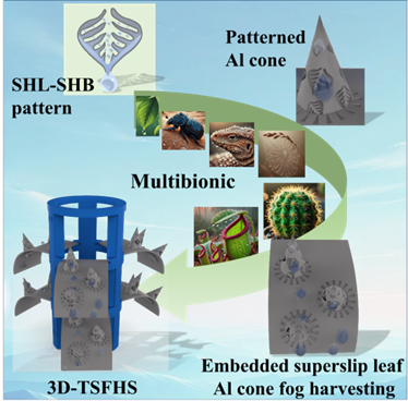 在应对全球水资源日益严峻的短缺挑战中,雾收集技术已成为一种有效的缓解策略。随着工业化的快速发展和人口的不断增长,对于高效、可拆卸和便于组装的雾收集系统的需求愈发迫切,同时对液滴捕获与传输机制的优化提出了更高的要求。本研究开发了一种新型的模块化仿生三维树状雾收集系统(3D-TSFHS),该系统受猪笼草的启发制备的超滑移叶片(SSL)实现了液滴的高效快速传输。本研究进一步借鉴了仙人掌、蜘蛛丝、沙漠甲虫、蜥蜴以及樟树叶等多种生物的独特润湿性和结构特性,成功制备了具有亲疏水相间图案的铝锥结构,显著提升了液滴捕获效率。这种设计有效增强了整体的捕获与传输机制效能。使得嵌入式超滑移叶片铝锥雾收集器大幅提高了雾收集效率,并展现出卓越的耐久性。将这种高效的雾收集器组装成三维树状结构系统(E-SLAC-FH),实现了0.462 g∙cm-2∙min-1的高效率。该系统的可拆卸和组装特性,结合其优异的耐久性,使其在实际应用中具有巨大的潜力,为解决水资源短缺问题提供了科学依据和技术支持。