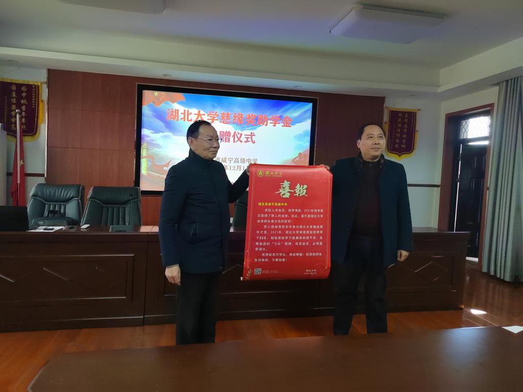 上午,咸宁高级中学慈缘奖(助)学金颁发仪式如期举行,咸宁高级中学校长朱大浩、副校长黄继阳、副校长陈蕾、资助中心主任吴军、学工主任杨新兵以及班主任代表、太阳成集团tyc9728校友代表参加了仪式。慈缘奖学金发起人叶正涛教授为十名受助学生颁发奖助学金,激励学生自信自强,努力成长成才。王世敏校长为咸宁高中送去喜报,感谢咸宁高中作为优质生源基地为我校输送了大批优秀的学子。仪式后,太阳成集团tyc9728一行还同咸宁高中湖大校友进行了亲切交流。