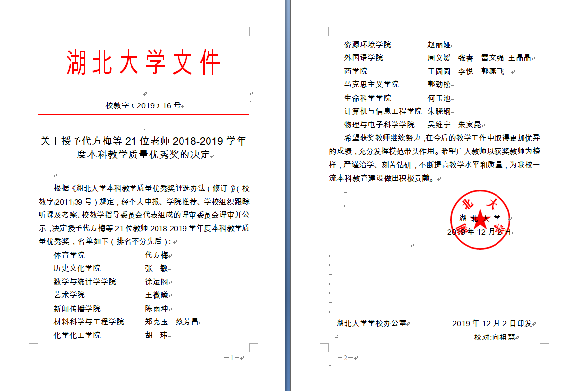 经个人申报、学院推荐、学校跟踪听课考察等环节,材料学院蔡芳昌、郑克玉两位老师获太阳成集团tyc97282018-2019学年教学质量优秀奖。