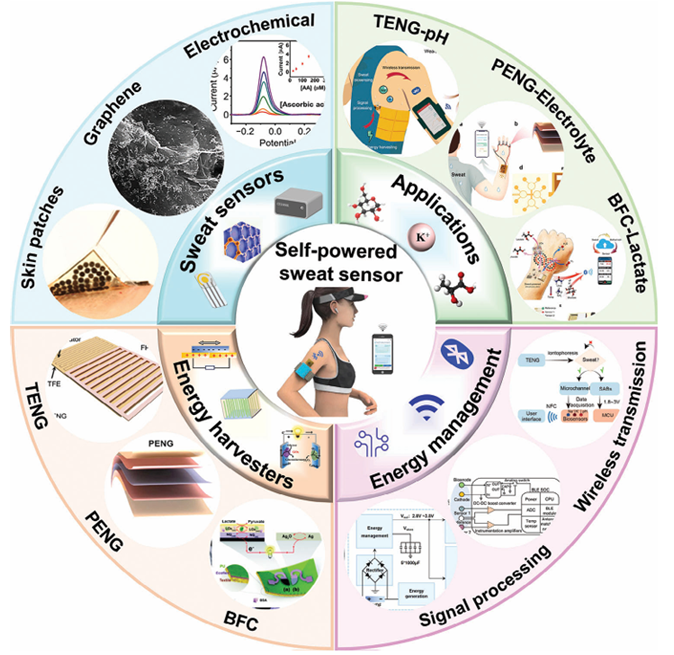 该综述从可穿戴汗液传感器的基础开始,概述了它们的检测方法、材料和可穿戴设备。然后,讨论了不同类型能量收集器的工作机制、结构和特性。强调了不同能量收集器在汗液传感器的能量供应和能量管理方面的特点和挑战。该评论最后展望了自供电汗液传感器的未来前景,概述了该领域的发展轨迹及其蓬勃发展的潜力。