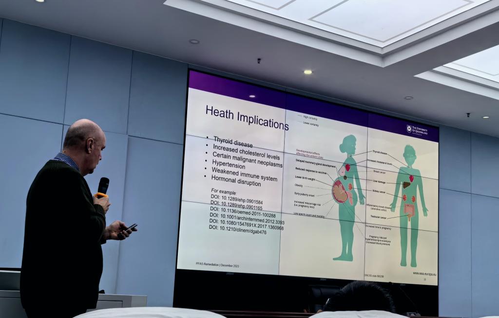 全氟烷基化合物,主要指全氟烷基磺酸(PFOS)和全氟烷基辛酸(PFOA)等,广泛用于不粘锅具、食品打包盒、泡沫灭火剂等生产领域。因其具有高毒性、持久性、生物积累性、远距离迁移性等性质,对人类健康和环境产生了严重的危害。报告中,Whittaker教授从PFOS和PFOA的结构特点出发,设计了一种以全氟聚醚为端基的阳离子嵌段共聚物,用于特异性结合PFOS和PFOA。并以此构建了高效吸附和快速磁回收的磁性氟化聚合物吸附体系。与市售的活性炭和离子交换树脂相比,该磁性氟化聚合物吸附剂在30 s内对污水中的的全氟污染物的脱除率可达95%以上,吸附容量为219 mg/g。最后展望了新型磁性氟化聚合物纳米颗粒用于人体血液中PFOS和PFOA吸附的前景。Whittaker教授的报告引起了师生的热烈反响,交流环节中,师生踊跃提问,Andrew教授逐一进行了耐心细致的解答。报告会后,Andrew Whittaker教授,Hui Peng研究员与学院领导就强化学院间的国际交流合作进行了深入讨论。