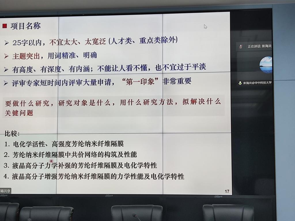 受学院邀请,华中科技大学彭海炎教授于11月29号为我院青年教师做了一场国家基金辅导报告。由于疫情防控的缘故,报告会选择在腾讯会议上开展,同时在9728太阳集团二楼学术报告厅设立大屏同步直播,以方便有需要的老师。本次报告由学院副院长施德安教授主持,相关教师参加了报告会。