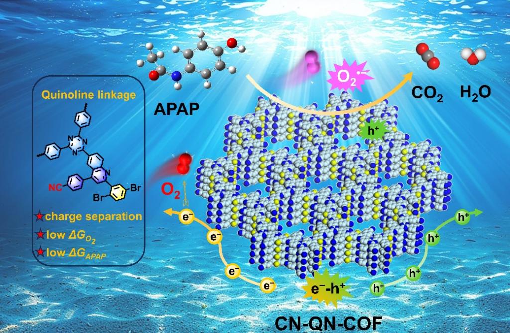 随着水环境中药物污染问题日益突出,对乙酰氨基酚等常用药物因其稳定性高、难以降解,已经成为潜在生态与健康风险因素。针对这一挑战,该研究团队设计并构建了一类基于三嗪单体的喹啉连接共价有机框架(R-QN-COFs),通过调控分子极性,实现了可见光下的超快速光催化水净化。该系列COFs采用一锅多组分Povarov反应合成,将不稳定的亚胺键转化为稳定的共轭喹啉单元,同时引入不同电子性质的取代基(–OMe、–H、–CN),赋予框架电子结构的精细调控。实验显示,CN-QN-COF在可见光照射下仅需10分钟即可将10 mg·L⁻1对乙酰氨基酚降解率提升至95%以上,明显优于其他同类材料。理论计算表明,–CN取代基降低了污染物吸附能、优化了电子分布,并加速了界面电荷转移,从而促进活性氧生成,推动高效降解。更值得注意的是,CN-QN-COF在连续流反应器中也表现出稳定、高效的水处理能力,显示出良好的实际应用潜力。这项研究不仅提出了通过分子极性调控优化COFs光催化性能的有效策略,也为开发高效、可持续的可见光水处理材料提供了通用设计范式。该成果为未来绿色水处理技术提供了新路径,有望推动光催化材料从实验室走向工业化应用,为水环境污染治理和可持续发展贡献创新解决方案。
