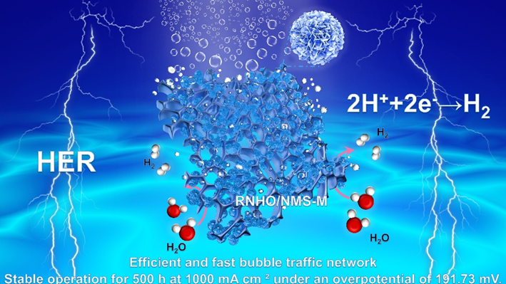在全球倡导“碳中和”时代背景下,构建以绿氢为主体的氢能体系,是推动能源结构深度转型的关键路径。由可再生能源驱动的碱性电解水制氢技术是实现规模化绿氢制备的理想途径,开发兼具低成本、高活性和长寿命特性的先进催化电极是推动该技术产业化的核心。然而,固-液-气三相界面处固有的传质/电荷转移限制,仍是新一代催化剂设计面临的重大挑战。针对这一问题,该研究团队通过将钌(Ru)掺杂的NiOOH纳米片定向锚定在NiMoSx微球表面,形成独特的纳米片-微球异质界面(RNHO/NMS-M),在安培级电流密度下实现了高活性、高稳定制氢。实验与理论分析表明:界面电子重分布效应促进H*从RuNiOOH的Ni位点向相邻Ru位点动态迁移,显著提升了析氢动力学。RNHO/NMS-M独特分级结构设计赋予其以下优势:①高比表面积与丰富活性位点分布;②超亲水/超疏气表面特性(接触角>150°);③超小气泡脱附尺寸(<50 μm);④毫秒级气泡释放速率(<30 ms),从而确保高效传质过程。性能测试表明:该材料在1 a cm⁻2工业级电流密度下仅需191.73 mV的低过电位,并保持500小时以上的超长稳定性;在模拟工业环境(30 wt% KOH,60℃)中,组装的电解槽仅需1.644 V超低电压即可驱动1 A cm⁻²电流密度,且连续运行100小时无明显衰减。本研究通过多级异质界面工程,为设计耐高电流密度电催化剂提供新范式。
