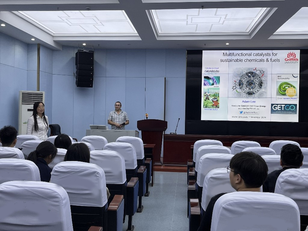 Adam Lee教授的报告题目为“Multifunctional catalysts for sustainable chemicals and fuels production”。报告中,Adam Lee教授从生物燃料和平台化学品合成催化技术设计中的挑战出发,讲述单功能-双功能-多功能催化剂的发展及多功能催化剂的优势,并阐述了合理设计纳米多孔固体酸和碱催化剂的方法及取得的研究进展,重点介绍了活性位点空间分离的重要性及催化级联技术处理低品质油得以生产生物柴油方面的应用价值。纳米多孔固体酸和金属纳米颗粒之间的协同作用也促进了热解生物油中酚类成分向碳氢燃料的主动和选择性升级,以及贵金属的节约活性位点区隔化和流动化学有助于化学级联产生有价值的化学中间体。Adam Lee教授详细的讲解,使学院师生受益匪浅。学院师生对Adam Lee教授的工作十分感兴趣,大家积极提问,Adam Lee教授耐心解答。最后,报告会在浓郁的学术氛围和热烈的掌声中结束。