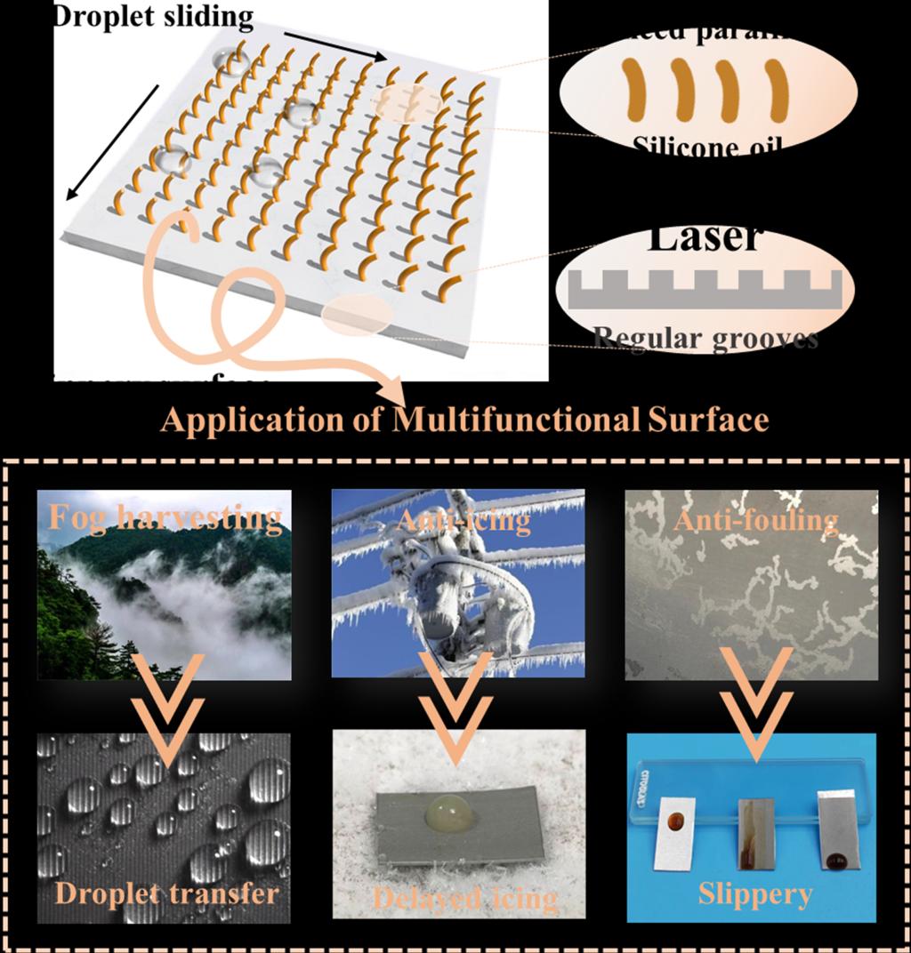 传统的润滑液体注入多孔表面(SLIPS)面临着液体泄漏和粗糙基底结构复杂制造等挑战,且在改性超疏水表面时常常用到含氟试剂对环境造成了污染。为了改善已有研究的不足之处,本研究从猪笼草和切片石蜡中获取灵感,开发了一种具有温度控制特性的多功能油凝胶注入表面(MIOS)。该表面制备技术简单,采用了一种安全且无毒的硅油热处理过程以获得低表面能。材料表面接触角在热处理后最高可达158°,显示出卓越的超疏水性。所制备的MIOS表面平均滑动角为3°,表现出优异的滑移性能。此外,这种创新的MIOS展示了高效的雾水收集能力,其雾水收集速率达到0.3222 g∙cm-2∙min-1,是激光铝板的2倍。该表面还具有显著的防冰性能,与纯铝板相比,结冰时间延长了21倍,同时保持了极低的冰粘附力,仅为0.16 N。与此同时,该表面还具有优异的防污性能,被污染的液滴能快速滑落且不留下残留物。这项研究有效解决了传统超滑移表面液体易泄漏的问题,同时具有多功能性和良好的耐久性,环保且简便的制备过程使其适合大规模应用。该研究为开发具备广泛应用的固体多功能超滑移表面提供了新的思路。