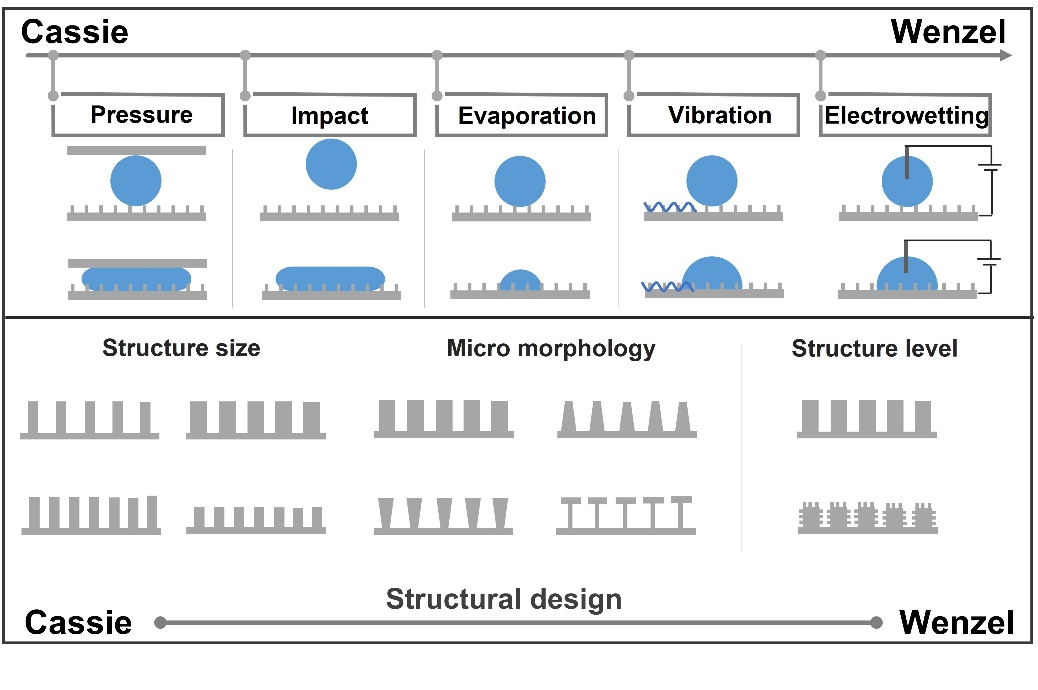 文章指出,材料表面润湿性中独特的现象——超疏水性——与水的接触角超过150°而滚落角低于10°在抗冰、减阻、自清洁、油水分离等领域有广泛的应用。但内在结构组成和外部环境条件都会影响超疏水表面的稳定性导致Cassie状态的转变,因此有必要进一步了解Cassie状态转变的影响因素和作用机制。文章综述了外界条件(包括压力、冲击、蒸发、振动和电润湿)促进材料表面润湿转变的现象、动力学行为和转变机理,以及特定形貌对Cassie状态的影响,包括结构尺寸、结构形状和结构层次。