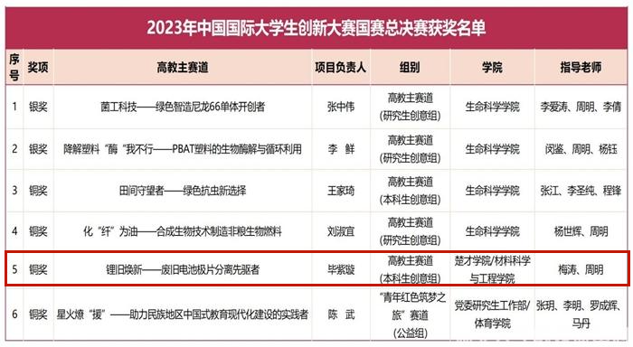近日,中国国际大学生创新大赛(2023)全国总决赛在天津大学落下帷幕。我院“锂旧焕新——废旧电池极片分离先驱者”项目从421万个参赛项目中脱颖而出,获全国总决赛铜奖。