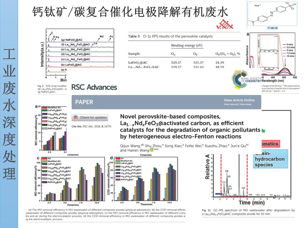 (5)工业废水深度处理技术,致力于开发新型阳极篮技术、生物质碳材料/钙钛矿新型催化降解材料等,为环保事业贡献科研力量。