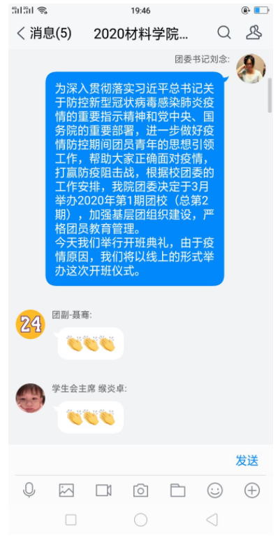 党委书记何顺进在致辞中说道,团课会采取较灵活的形式进行,全体团员要在实践中学习,在学习中思考。何书记还强调,疫情当前,我们要积极践行“青春战疫,青年担当”的精神,助力打赢疫情防控阻击战。何书记致辞后,同学们反响热烈,学习热情高涨。