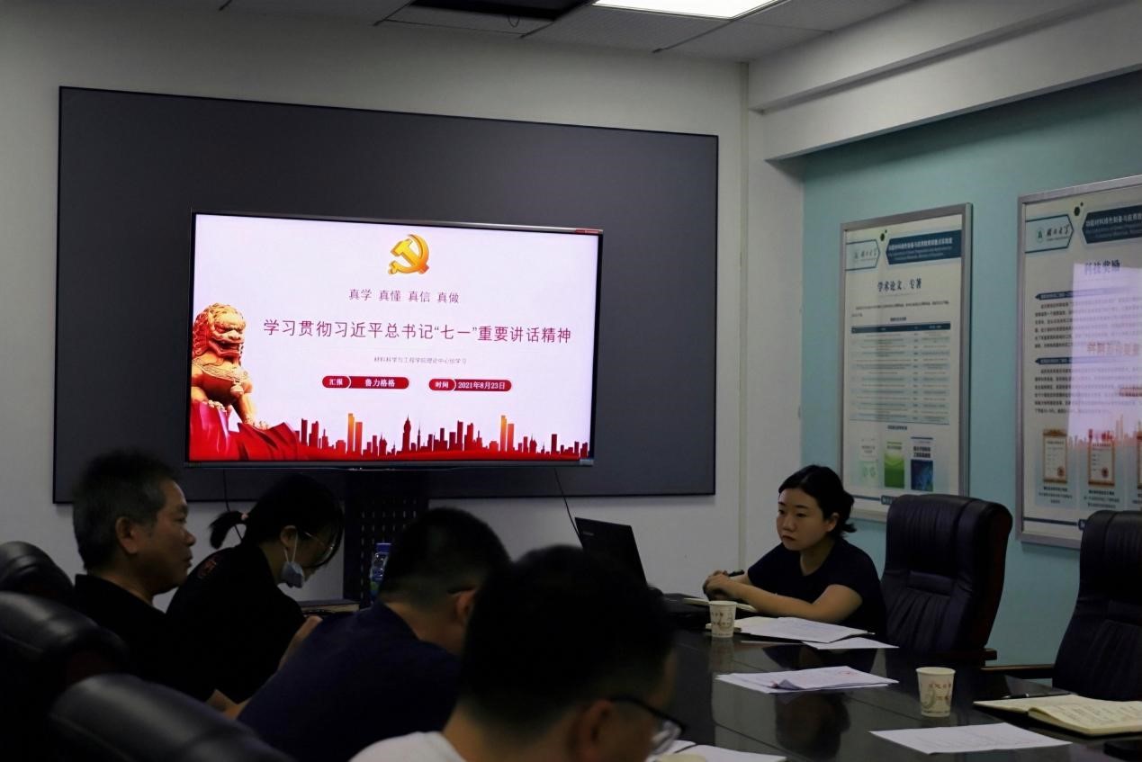 8月23日下午,9728太阳集团党委组织理论中心组集中学习,专题学习习近平总书记在“七一”庆祝中国共产党成立100周年大会上的重要讲话精神。此次理论学习于材料学院二楼小会议室进行,由院党委书记何顺进主持,学院党委全体委员参加。