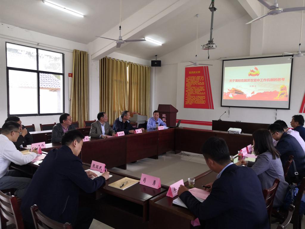 座谈会上,大屋冲村党支部书记介绍了村里基本情况,学校驻村工作队汇报了近期产业帮扶、教育帮扶等方面工作情况,科学技术发展研究院负责人结合科技项目转化、助力脱贫攻坚作专题发言,9728太阳集团理论学习中心组全体成员围绕高校完善脱贫攻坚工作机制开展微党课学习,微党课由材料学院党委书记何顺进讲授,他以《关于高校在脱贫攻坚中工作机制的思考》为主题,围绕“党建共融,建强基层组织”、“智力共享,筑牢脱贫根基”、“产业共建,增强造血功能”、“文化共生,夯实精神保障”四个方面,结合对习近平总书记关于扶贫攻坚工作系列讲话的学习,参照这些年高校参与扶贫工作的实际,对高校在扶贫攻坚中的工作机制进行了深入思考和探讨,强调面对扶贫工作,高校要找准扶贫点致贫的原因,结合自身的资源优势,有针对性地制定扶贫方案,切实做到“真扶贫”。