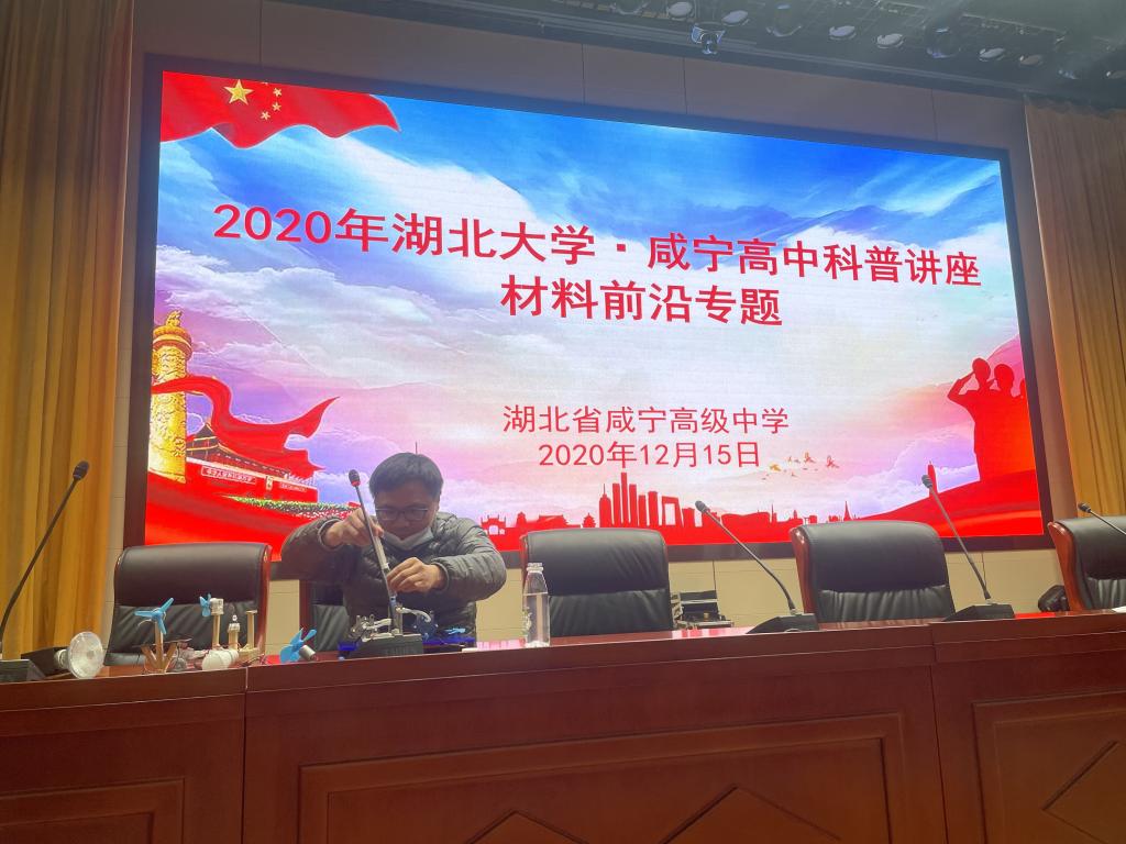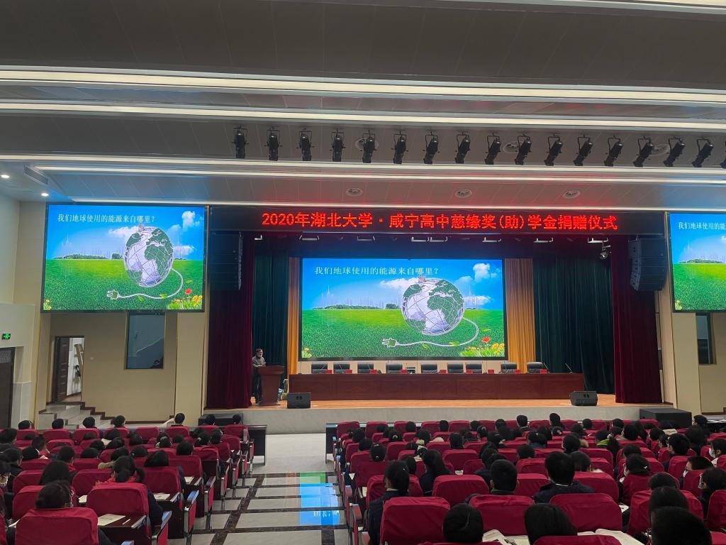 慈缘奖(助)学金颁发仪式在四百多名高中学子的见证下举行。王校长逐一为十名受助学生每人颁发一千元助学金,激励学生自信自强,努力成长成才。仪式上,王校长还给咸宁高中送去喜报,感谢咸宁高中作为优质生源基地为我校输送了大批优秀的学子。随后,李金华教授以清洁能源为主题,为高中生做了一堂材料前沿科普讲座,并就湖大校史、地理位置及科普讲座内容等提问互动,活动现场气氛热烈,会后还有学生留下来与湖大老师交流,询问湖大招生分数线等报考相关问题。