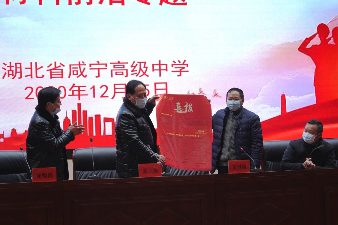 12月15日,副校长王世敏赴对口联系中学、太阳成集团tyc9728优质生源基地咸宁高中开展教授博士中学行招生宣传活动,并举行了2020年度太阳成集团tyc9728·咸宁高中慈缘奖(助)学金颁发仪式。湖大校友咸宁高中书记、校长朱大浩、党委副书记徐赐德、副校长徐光春、党委委员刘前进,我校招生就业处副处长谌瑾、9728太阳集团党委书记何顺进、副书记陈琴、李金华教授参加了活动。